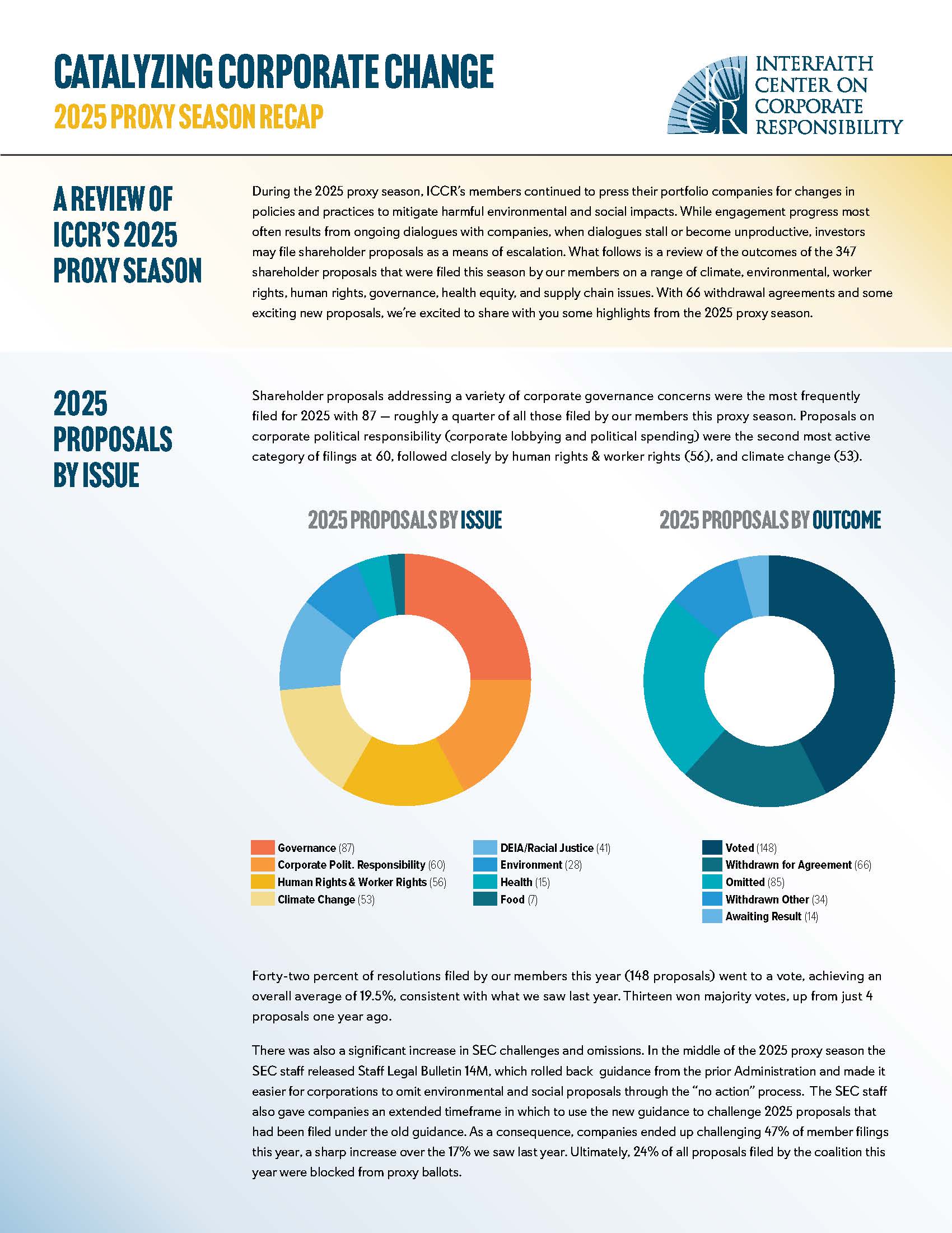 During the 2025 proxy season, ICCR’s members continued to press their portfolio companies for changes in policies and practices to mitigate harmful environmental and social impacts. While engagement progress most often results from ongoing dialogues with companies, when dialogues stall or become unproductive, investors may file shareholder proposals as a means of escalation. What follows […]