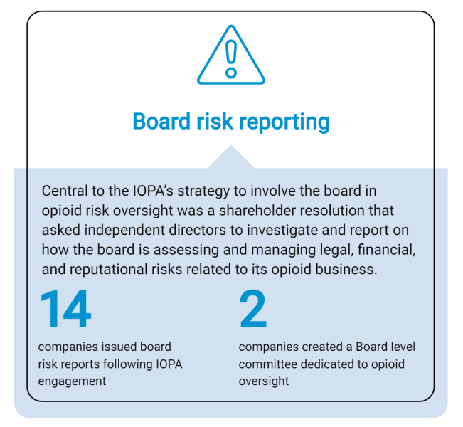 According to the CDC, opioids were involved in nearly 80,000 overdose deaths in 2022, a crisis that continues to ravage communities across the country. The sale and distribution of opioid medications carries significant legal and reputational risks for companies with long term and systemic societal and economic impacts. Through dialogues and shareholder resolutions at key companies, investor members made the clear business case for strengthened board-level oversight and other governance reforms to significantly reduce opioid-related risks.